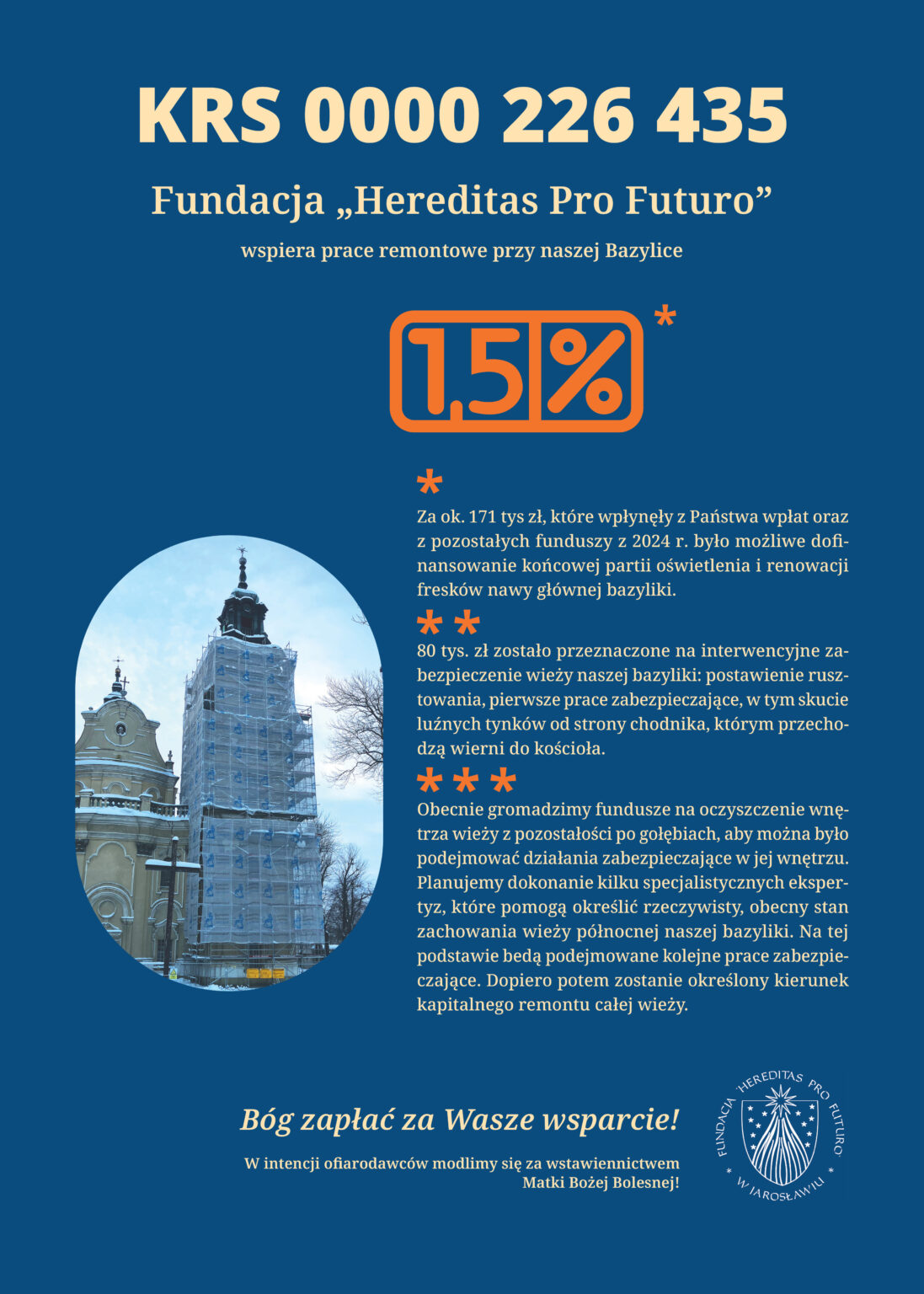 Nasza fundacja otrzymała status Organizacji Pożytku Publicznego, a to oznacza, że możecie Państwo wspierać fundację „Hereditas pro Futuro” przekazując 1,5 % podatku dochodowego lub po prostu złożyć darowiznę.